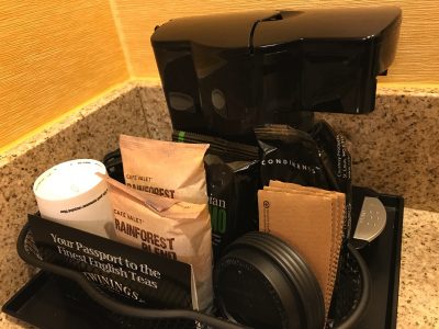 部屋によっては、お水のボトルがおかれていたり、コーヒーがおいてあることが多いです。