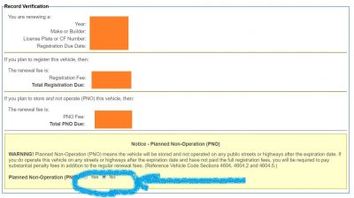 もし車を数台持っている、趣味でクラシックカーを所有しているなどで、計画的にこの車は1年間は乗らないなという場合、Planned Non-Operationとして車両登録をすると、格安の登録料金で更新ができます。お知らせレターに書かれた、PNOの金額が、その更新金額です。PNOで更新して、通常の道路で走るのは違反になりますので、気を付けましょう。使わずに、車庫で保存しておくのはオッケー。